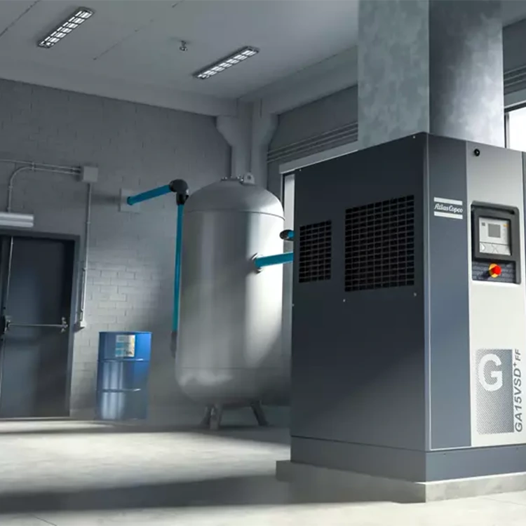 Některé vzduchové kompresory jsou „namontované na nádrži“, což znamená, že jsou dodávány jako kompletní jednotka a jsou instalovány na horní straně nádrže na příjem vzduchu. Použití vzduchových kompresorů tankového typu nejen šetří místo, ale také snižuje počáteční náklady na instalaci nutné pro instalaci jednotlivých sušiček. Tato konfigurace je velmi běžná u malých vzduchových kompresorů a výstupní výkon obvykle nepřesahuje 26 kilowattů (nebo 35 koňských sil). Velké vzduchové kompresory nejsou vhodné pro konstrukci nádrží, protože by to vedlo k těžkému nastavení, které by mohlo představovat bezpečnostní riziko.