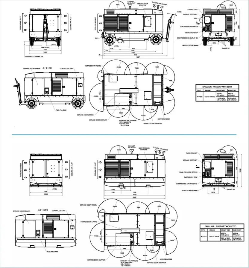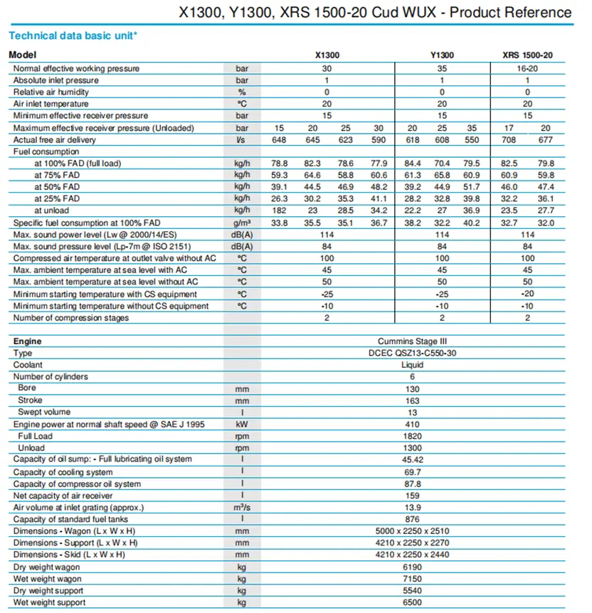 Atlas Copco X1300, Y1300 a XRS 1500-20 jsou odhlučněné dvoustupňové šroubové kompresory se vstřikováním oleje, které pohání kapalinou chlazený šestiválcový dieselový motor Cummins.