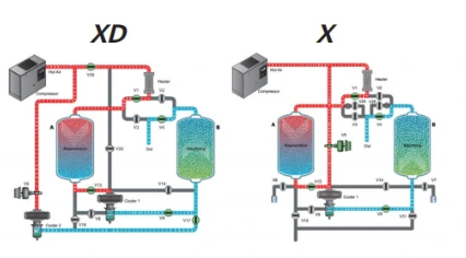 Kromě toho jsou kompresní tepelné sušičky XD nebo X skutečně sušičky s nulovou spotřebou vzduchu, nespotřebovávají žádnou energii nebo jen část stlačeného vzduchu během fáze foukání za studena.