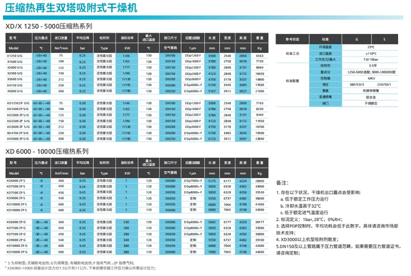 Kompresní tepelné adsorpční sušičky XD nebo X využívají vysoce kvalitní adsorbenty a efektivně využívají kompresní teplo z bezolejového kompresoru k regeneraci adsorbentu, což výrazně snižuje spotřebu energie a náklady na údržbu.
