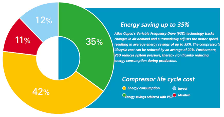 Spotřeba energie představuje více než 80 % celkových nákladů životního cyklu bezolejového šroubového vzduchového kompresoru. Elektřina použitá při výrobě stlačeného vzduchu navíc představuje více než 40 % celkových nákladů továrny na elektřinu. Aby se snížily náklady na energii, společnost Atlas Copco vyvinula technologii Variable Frequency Drive (VSD) v průmyslu stlačeného vzduchu. VSD nejen šetří značné množství energie, ale také chrání životní prostředí pro budoucí generace. Díky neustálým investicím do této technologie je společnost Atlas Copco schopna nabídnout nejširší sortiment integrovaných kompresorů VSD na trhu.