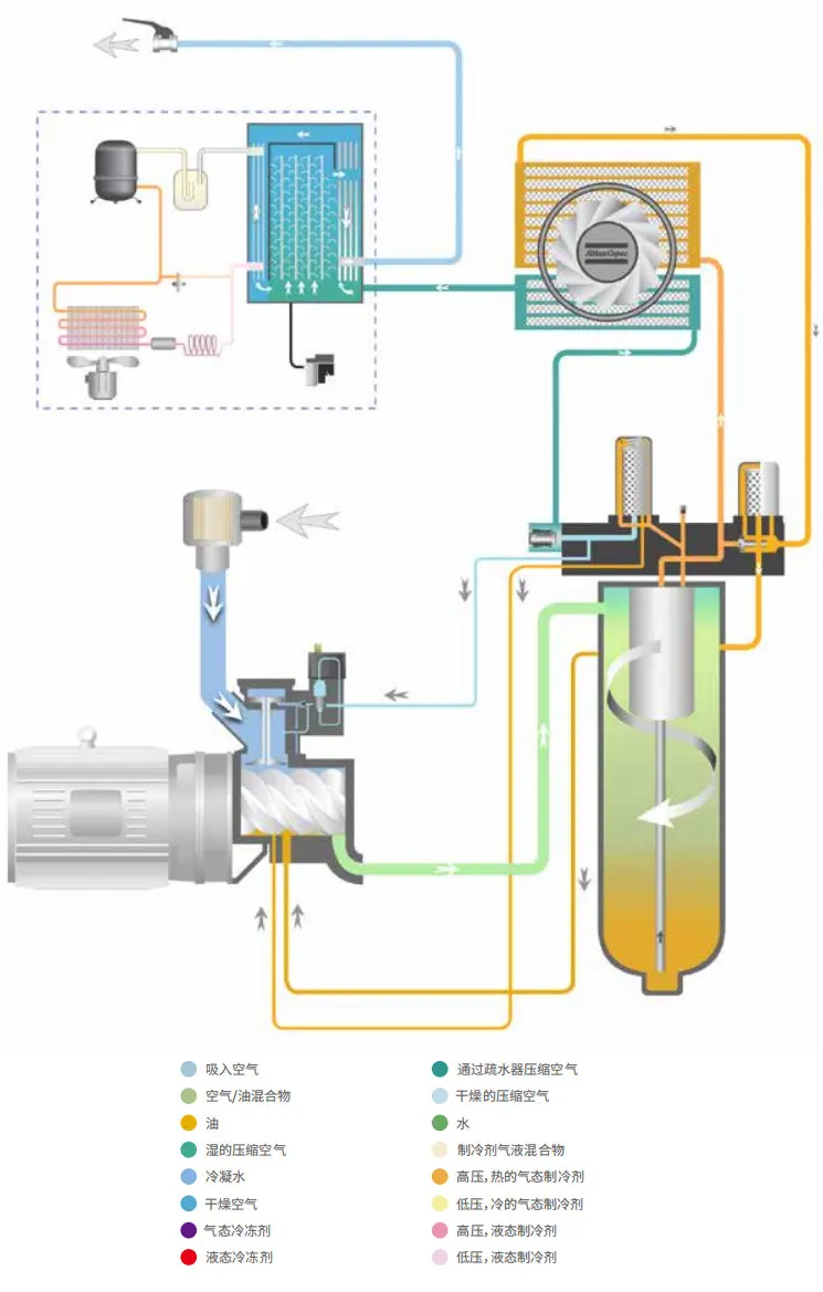 · Nezávislé chladicí ventilátory, vysoce účinné chladiče a vestavěné sušičky s tlakem rosného bodu 3 °C lépe zabraňují kondenzaci a korozi potrubí v potrubní síti