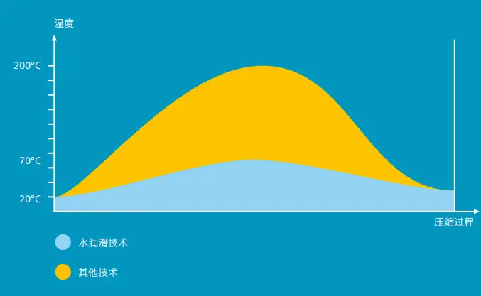 Voda má vynikající chladicí výkon a účinně odvádí teplo ze zdroje. Odpadá energetické plýtvání způsobené tvorbou tepla a na kilowatt energie lze vyrobit více stlačeného vzduchu. Chladnější stlačený vzduch snižuje tepelné namáhání součástí, a tím prodlužuje životnost.