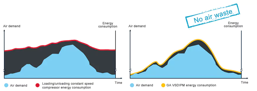 Řada VSDiPM společnosti Atlas Copco dokáže automaticky upravit rychlost motoru tak, aby přesně řídila a splnila požadavky zákazníků na spotřebu plynu. V porovnání s kompresory poháněnými stanovenými otáčkami šetří vzduchový kompresor s proměnnou frekvencí VSD v průměru až 35 % energie.