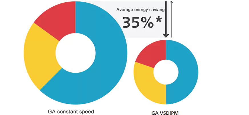 Společnost Atlas Copco porovnala několik zařízení a provedla dlouhodobé testy, aby dospěla k závěru, že GAVSD IPM šetří v průměru o 35 % více energie než model GA s pevnou frekvencí.